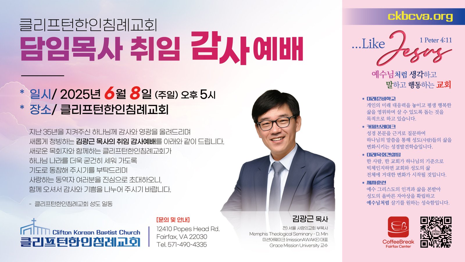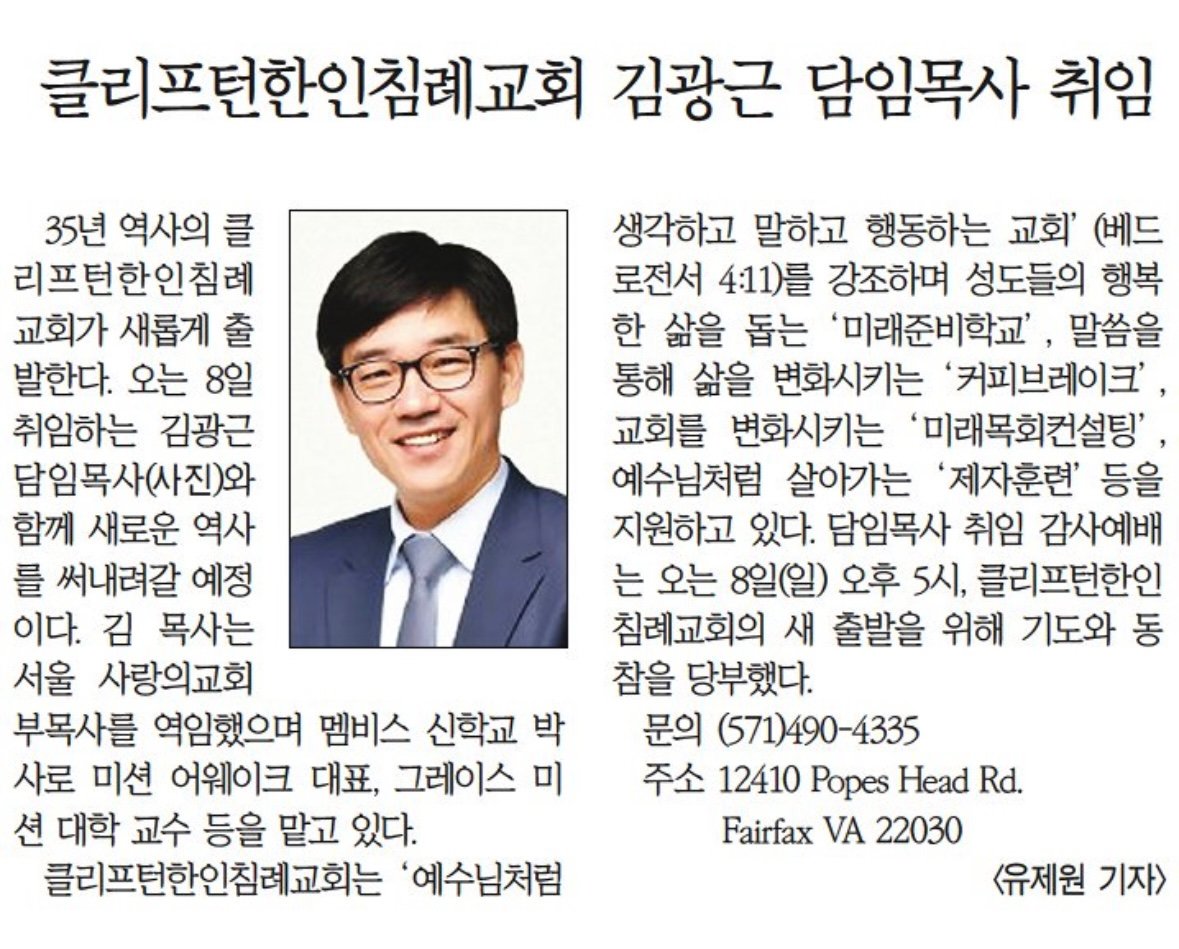 새로운 목회자와 함께하는 클리프턴한인침례교회가 하나님 나라를 더욱 굳건히 세워 가도록 기도로 동참해 주시기를 부탁드리며 사랑하는 동역자 여러분을 진심으로 초대하오니.